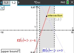 4.  Use the INTERSECTION option twice to find the two locations where the graphs intersect.