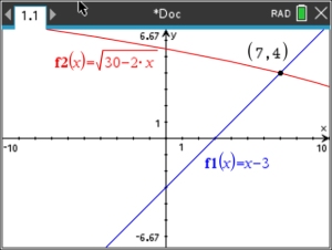 Hint:  When working with radical equations, it may be difficult to "see" the intersection point if the viewing window is a small representation of the graph.  You may want to enlarge the viewing window by adjusting the WINDOW settings (, #4 Window/Zoom, #1 Window Settings).