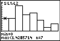 | 3. To see the histogram, press ZOOM and #9 ZoomStat. Press the TRACE key to see on-screen data about the histogram. The screen to the right shows the histogram developed directly from the ZoomStat choice of increments. Not so nice increments! |